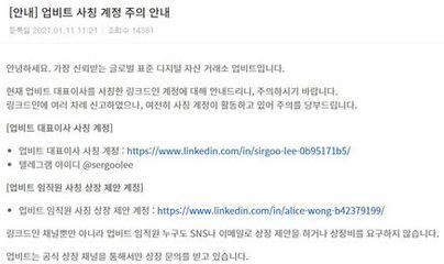 12일 관련 업계에 따르면 업비트는 전날 자체 홈페이지를 통해 업비트 사칭 계정을 주의해달라고 밝혔다. 업비트는 "현재 업비트 대표이사를 사칭한 링크드인 계정에 대해 안내드리니, 주의하시기 바란다"며 "링크드인에 여러 차례 신고하였으나, 여전히 사칭 계정이 활동하고 있어 주의를 당부드린다"고 밝혔다.
