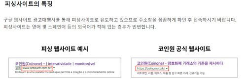 얼마 전 코인원 역시 자체 홈페이지를 통해 "코인원 홈페이지https://coinone.co.kr/ 주소를 주의 깊게 살펴보지 않는 경우를 노린 피싱사이트로의 접속을 주의해달라"며 "보통 'coino-ne.com'이나 'coinon-e.com' 등의 도메인으로 되어있으며 광고대행사를 통해 피싱사이트로 접속을 유도한다"고 밝혔다.