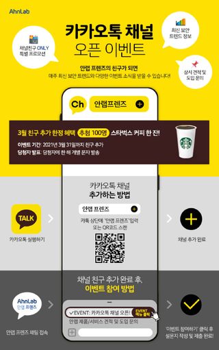 안랩은 오는 31일까지 안랩 프렌즈 채널을 친구로 추가한 고객 가운데 100명을 추첨해 커피 교환권을 증정한다. 이벤트 참여를 원하는 고객은 카톡 채널 안랩 프렌즈를 친구로 추가한 후 채널 내 이벤트 참여 페이지에 접속해 설문지를 제출하면 된다.