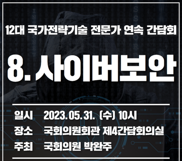 국회 과학기술정보방송통신위원회 소속 박완주 의원(무소속)은 오는 31일 오전 10시 국회의원회관 제4간담회의실에서 '12대 국가전략기술-사이버보안 민‧관‧학‧연 전문가 간담회'를 연다고 30일 밝혔다.