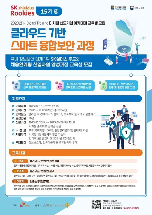 SK쉴더스는 클라우드 보안 분야 인재 양성을 위한 'SK쉴더스 루키즈' 15기를 공개 모집한다고 8일 밝혔다.