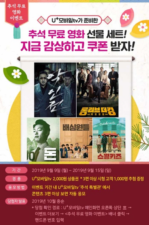 U+모바일tv의 경우 15일 까지 악인전, 미스 스티븐스, 기묘한 가족 등 총 10개 영화를 무료 제공한다. 또 3편 이상 시청시 응모가 가능한 증정 이벤트를 진행한다. 추첨을 통해 총 1000명에게 U+모바일tv 2000원 상품권을 증정한다.