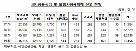 올 상반기 중 불법사금융신고센터를 통해 접수된 피해신고는 총 5만1456건이었다. 이 중 서민금융상담(3만6216건)이 70.4%로 가장 많고, 보이스피싱(1만2972건, 25.2%), 미등록대부(1129건, 2.2%), 불법대부광고(514건, 1.0%) 순으로 나타났다.