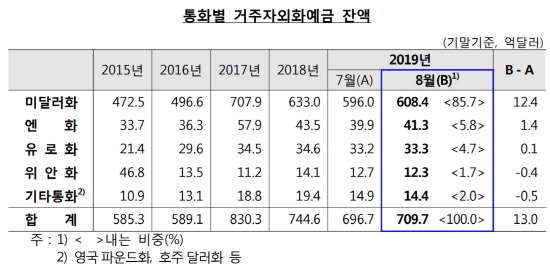 한국은행이 18일 발표한 '2019년 8월중 거주자외화예금 동향'에 따르면 지난달 말 기준 외국환은행의 거주자외환예금 잔액은 전월대비 13억달러 늘어난 709억7000만달러로 집계됐다.