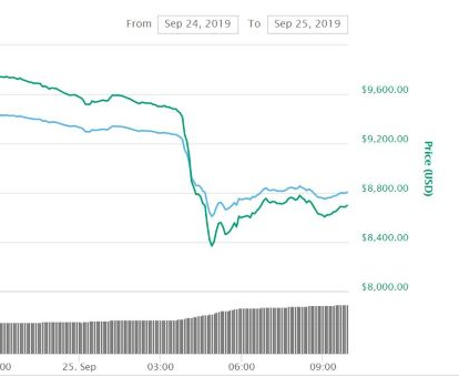 BTC가 본격 하락한 시점은 오늘 새벽 3시로 파악됐다. 당시 9400달러 선을 횡보하던 BTC는 새벽 3시를 기점으로 폭락하더니 새벽 4시 50분경에는 8370달러까지 고꾸라졌다.