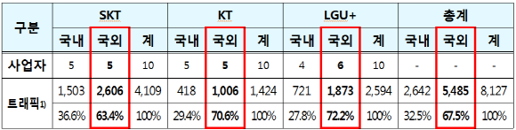 KT는 상위 10개 사업자 트래픽 1,424TB 중 70.6%인 1006TB가 글로벌 CP가 유발했다. LG유플러스는 상위 10개 사업자 중 6개 글로벌 CP가 전체 2594TB중 1873TB를 유발해 72.2%의 비중을 보였다.