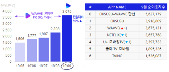 1위는 옥수수로 391만8809명이다. 넷플릭스는 365만7768명으로 3위로 처졌다. 이어 U+모바일(4위), 올레 tv 모바일(5위), 티빙(6위) 순이었다. 옥수수와 웨이브를 합친 순 이용자수는 562만7179명에 달한다. 트래픽 중복을 제외한 이용자 수 합산 추정치다.