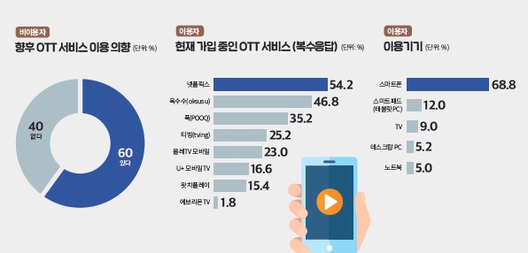 OTT 이용자들은 하루 평균 주중 70분, 주말 124분을 시청하고 있었다. 대부분 스마트폰(68.8%)을 통해 서비스를 이용하고 있으며 '혼자'(78.6%) 시청했다.