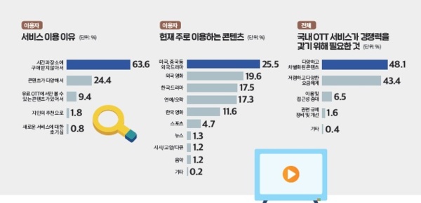 이 연구원은 "국내 OTT 기업은 △다양하고 차별화된 콘텐츠(48.1%) △저렴하고 다양한 요금체계(43.4%) △빅데이터에 기반한 추천 프로그램 등 소비자의 효용을 충족시킬 수 있는 사업 모델을 발굴해 글로벌 OTT 기업에 대응할 수 있는 경쟁력을 갖춰야 한다"고 밝혔다.