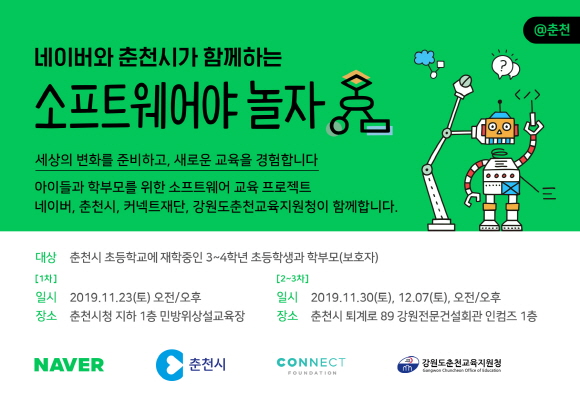 네이버는 내년부터 춘천시 및 강원도춘천교육지원청과 함께 시내에 위치한 학교에서 소프트웨어 교육을 진행한다고 11일 밝혔다.