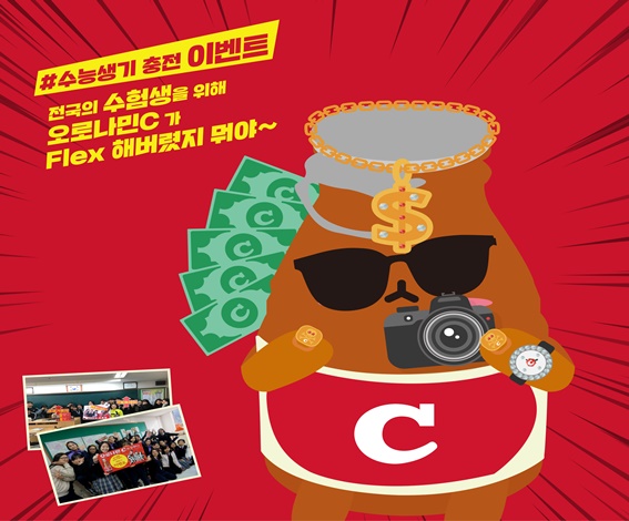 ▶ '오로나민C 수능생 기충전 이벤트' 포스터.ⓒ동아오츠카 동아오츠카는 '오로나민C 수능생기 충전 이벤트'를 진행한다고 17일 밝혔다. 이번 행사는 수능을 치른 고3 수험생을 응원하기 위해 기획됐다. 행사는 전국 고3 수험생과 담임교사가 대상이다. 오로나민C의 특징을 담은 학급 단체 사진을 인스타그램에 올리면 된다. 선정 기준은 소비자 참여 수(댓글 수)와 표현력이다. 참여 기간은 오는 24일까지다. 당첨자 발표는 다음 달 25일 예정됐다. 동아오츠카는 1등 학급에 '2019 렛츠기릿 콘서트' 티켓과 전교생이 먹을 수 있는 오로나민C를 준다.