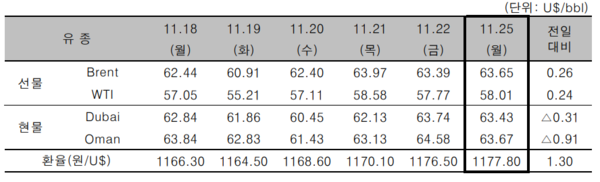 유럽거래소(ICE)의 브렌트유(Brent) 가격은 전일 대비 배럴당 0.26달러 상승한 63.65달러로 집계됐다.
