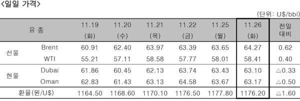 한국석유공사에 따르면 26일 미국서부텍사스중질유(WTI) 가격은 전일보다 배럴당 0.4달러 오른 58.41달러를 기록했다. 영국 북해산유(Brent) 가격은 전일보다 0.62달러 오른 64.27달러를 기록했다. 반면 중동 두바이유(Dubai)는 전일보다 0.33달러 하락한 63.10달러를 기록했다.