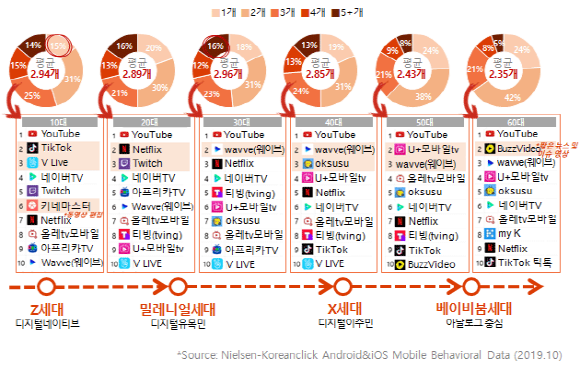 6일 닐슨코리안클릭에 따르면 전연령층에서 평균 2개 이상의 동영상 앱을 사용하는 것으로 나타났다. 40대 이하 연령층에서는 2개 이상의 앱을 사용하는 비율이 80% 이상으로 높았다.