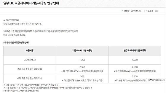 LG유플러스 관계자는 "요금제 명칭은 같지만 사실상 새로운 요금제로 봐야한다"며 "이에 데이터 혜택을 받으려면 대리점이나 고객센터를 통해 고객이 직접 변경 신청을 해야한다"고 말했다.