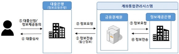 소비자가 은행에서 대출을 받을 때 다른 은행 계좌잔고 등 자산정보를 편리하게 활용하는 방안을 추진한 금융당국은 고객이 정보조회에 동의하면 대출은행이 고객의 다른 은행 금융자산을 일괄조회해 금리·한도산정 등에 참고자료로 활용할 수 있도록 했다.