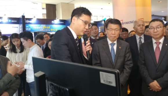 18일 서울시 중구 소재 웨스틴조선호텔에서 열린 '오픈뱅킹 서비스 출범식'에 참석한 은 위원장은 기자들과 만나 "오늘 오픈뱅킹이 출범하고 18개 은행과 핀테크 기업들이 참여하는데 향후 제2금융권으로 확대하겠다는 방침"이라며 "오픈뱅킹을 운영하면서 안정성이 확인된 이후 제2금융권의 참여를 추진하겠다"고 말했다.