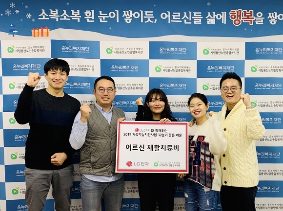 ▶ LG전자 직원들이 지난 21일 서울 용산구에 위치한 시립용산노인종합복지관을 찾아 독거노인을 위한 재활치료비를 전달했다. LG전자가 연말을 맞아 주변의 소외된 이웃들에게 따뜻한 마음을 전했다. LG전자는 올해 임직원들이 사내 식당에서 ‘기부메뉴’식단을 운영하며 모은 기부금 약 2300만원을 서울, 인천, 평택, 구미, 창원 등에 있는 국내 사업장 인근의 소외된 이웃들에게 전달했다고 24일 밝혔다. LG전자는 2011년부터 국내 전 사업장에서 짝수 달에 한 번씩 ‘기부메뉴’ 식단을 운영하고 있다. 기부메뉴는 반찬을 줄여 원가를 낮춘 만큼을 기부한다. 임직원들이 기부메뉴를 통해 자발적으로 기부활동에 참여하는 방식이다.