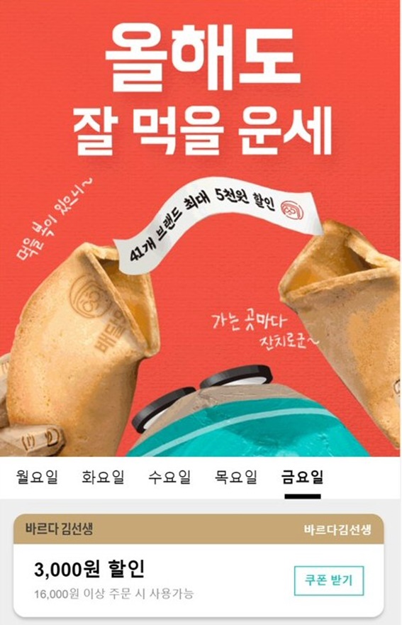 배민앱의 이벤트 페이지 중 '올해도 잘 먹을 운세'에서 바르다 김선생 할인 쿠폰을 다운받아 이용할 수 있다.