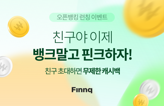 핀크(Finnq, 대표이사 권영탁)가 오픈뱅킹 전면 시행을 기념하며 친구 초대 시 무제한 캐시백을 증정하는 '오픈뱅킹 런칭 이벤트'를 진행한다고 14일 밝혔다.