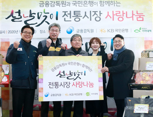 ▶ 금융감독원과 KB국민은행은 설을 앞둔 20일 국제구호단체 기아대책과 함께 서울 마포구 망원시장을 방문해 나눔 활동을 했다.ⓒEBN 금융감독원과 KB국민은행은 설을 앞둔 20일 국제구호단체 기아대책과 함께 서울 마포구 망원시장을 방문해 나눔 활동을 했다. 금감원은 국민은행과 마련한 후원금 총 5900만원으로 설 성수품을 사서 전통시장 상품권과 함께 사회복지단체 30여곳에 전달했다. 윤석헌 금감원장은 이날 직접 생필품을 사면서 상인들의 애로 사항을 들었다. 금감원은 전통시장 활성화를 지원하고 나눔 활동을 하기 위해 매년 설과 추석에 전통시장을 방문해왔다.