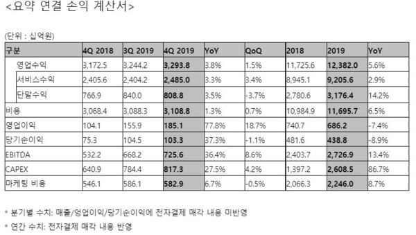 2019년 4분기에는 매출액 3조2938억원, 서비스수익 2조4850억원, 영업이익 1851억원을 기록했다. 전년 동기 대비 매출 3.8%, 서비스수익 3.3%, 영업이익 77.8% 늘어난 수치다.