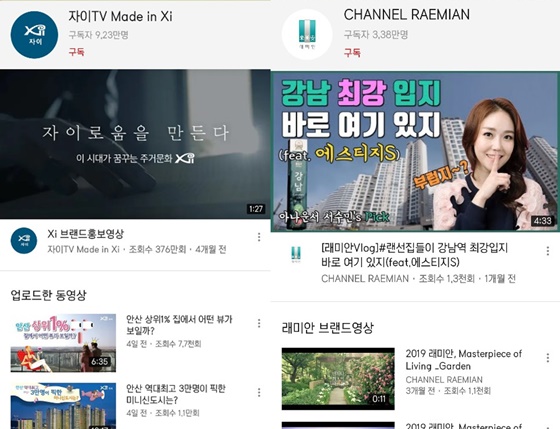 삼성물산의 '채널 래미안'도 아파트 중심 영상이 많이 올라와 있다. 실제 입주민들이 래미안의 부대시설을 이용하는 영상인 '래미안Vlog'가 대표적이다. 채널 래미안의 구독자 수는 3만3800만이다.