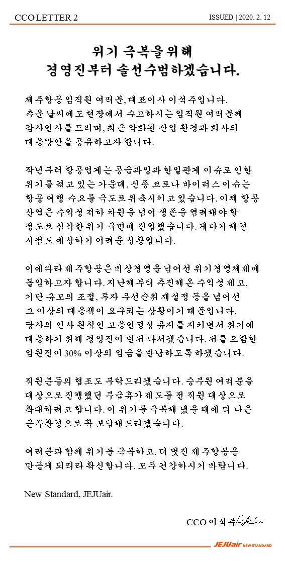 이석주 제주항공 대표는 12일 사내메일을 통해 "작년부터 항공업계가 공급과잉과 한일 관계 이슈로 인한 위기를 겪고 있는 가운데, 신종 코로나바이러스 감염증 이슈로 항공여행 수요가 극도로 위축되면서 항공산업은 수익성 저하 차원을 넘어 생존을 염려해야 할 정도로 심각한 위기 국면에 진입했다"고 말했다.