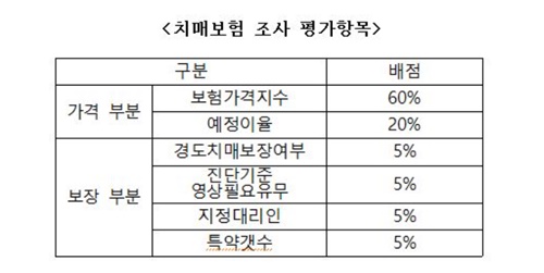 평가항목은 가격·보장부분으로 나눠 보험가격지수, 경도치매보장여부, 예정이율, 진단기준, 지정대리인, 특약 개수로 각 점수를 부여해 총점으로 순위를 비교했다.