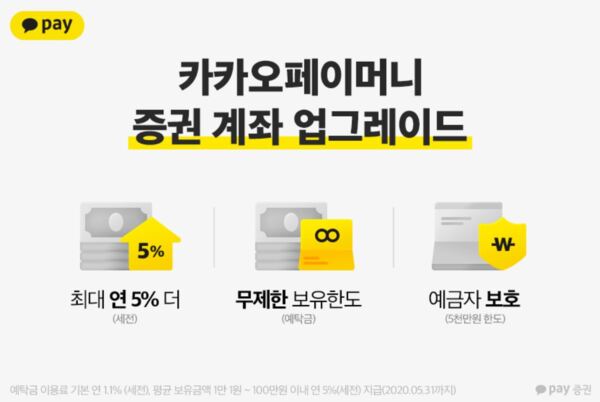 카카오페이머니를 증권 계좌로 업그레이드 하면 자동 예탁되는 계좌 잔액에 대해 카카오페이증권으로부터 시중금리보다 높은 최대 연 5%(세전)를 주간 단위로 받을 수 있으며 무제한 보유한도 및 예금자 보호(1인 당 최대 5000만원) 등의 혜택도 적용된다.