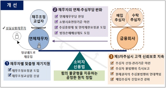 일정기간 내 연락횟수를 제한하는 추심총량제와 채무자가 특정 연락방법의 제한을 요구할 수 있는 연락제한요청권, 불법추심행위에 대한 법정손해배상제도 등이 도입되며 소멸시효완성채권, 채무조정 절차 중인 채권, 채권자변동정보 조회시스템 미등록 채권 등에 대한 추심은 제한된다.