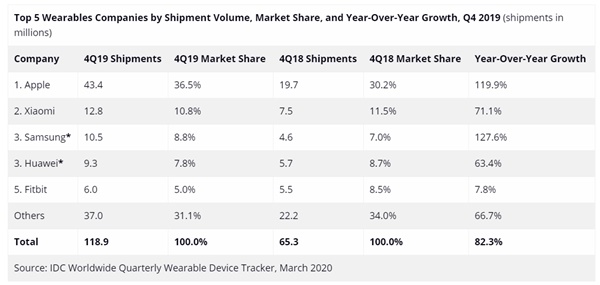 화웨이는 지난해 4분기 출하량 930만대를 기록하며 4위로 떨어졌다. 시장점유율은 7.8%로 전년 동기 대비 0.9% 빠졌다. 5위는 핏빗으로 출하량 60만대, 점유율 5%를 기록했다.