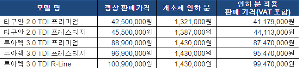 한편 이번 개소세 인하분 반영과 함께 폭스바겐 티구안 2.0 TDI 프리미엄 모델의 경우 3월 한달 간 특별 무이자 할부 프로그램도 제공된다. 폭스바겐파이낸셜서비스코리아는 티구안 2.0 TDI 프리미엄 구입 고객들을 대상으로 최대 3년 무이자 할부 프로그램과 3년 신차보상교환 프로모션을 마련했다.
