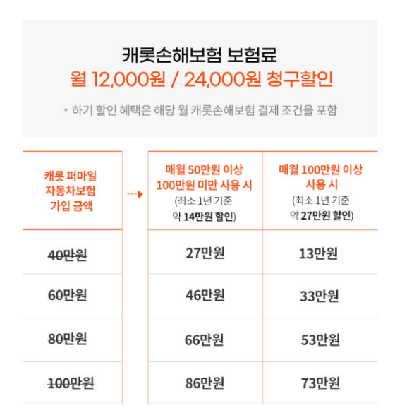 고객이 카드를 발급 받은 달에 보험료를 결제할 경우, 첫 달은 카드 이용 실적과 무관하게 1만2000원이 할인된다. 2개월 차부터 24개월 차까지는 전월 카드 이용실적이 50만원 이상 100만원 미만이면 월 1만2000원을, 전월 이용실적이 100만원 이상이면 월 2만4000원을 할인해준다. 보험료 할인 25개월 차부터는 전월 카드 이용금액 50만원 이상 시 월 6000원의 할인 혜택이 주어진다.