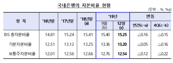 19일 금융감독원에 따르면 2019년말 국내은행의 BIS기준 총자본비율, 기본자본비율, 보통주자본비율은 각각 15.25%, 13.20%, 12.54%로 나타났다. 이는 전년말 대비 0.16%p, 0.05%p, 0.12%p씩 하락한 수치다. 단순기본자본비율은 6.51%였다.