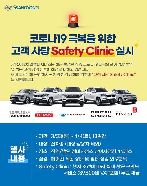 쌍용자동차가 코로나19 감염 예방을 위해 '고객 사랑 Safety Clinic' 차량점검 서비스를 실시한다고 23일 밝혔다.