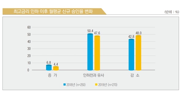 최고금리 인하 이후 '월평균 신규대출 승인율'이 감소했다고 응답한 비율(48.0%)도 전년대비 4.2%포인트 증가했다.