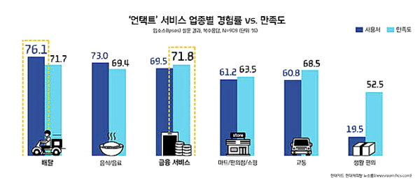 현대카드·현대캐피탈이 발표한 언택트 소비 트렌드 분석 결과에 따르면 지난해 1월부터 5월까지 40대가 언택트 관련 가맹점에서 결제한 금액은 2017년 동기 대비 500% 뛰었다. 또한 응답자의 68.7%가 언택트 서비스 선택 이유로 '대기 시간 감소'와 '편리한 결제', '시간과 장소에 구애 받지 않는 주문' 등을 꼽아 '편의성'을 가장 중요시하는 것으로 집계됐다.