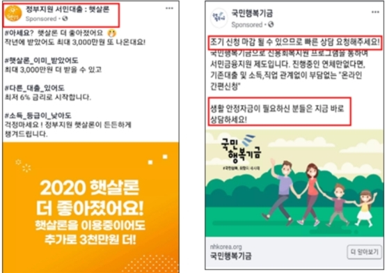 최근 불법 대출업체들은 정책자금을 지원받아 서민대출을 취급하는 '서민금융지원센터', '국민행복기금' 등 공공기관을 사칭해 "저금리 금융지원", "직장인 대상 정부지원 대출 모바일 신청" 등의 온라인 광고(SNS 등)를 대량 노출함으로써 서민 피해가 우려되는 상황이다. 또한 코로나19로 인한 불안감 등을 악용해 코로나19 대출상품으로 가장한 문자 메시지, 전단지 등의 광고를 통해 불법대출을 시도하고 있다.