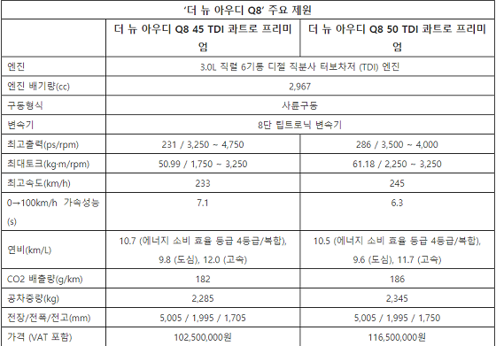 이번에 들어오는 아우디 Q8은 '더 뉴 아우디 Q8 45 TDI 콰트로 프리미엄'과 '더 뉴 아우디 Q8 50 TDI 콰트로 프리미엄' 등 2가지 디젤 라인업으로 구성된다.