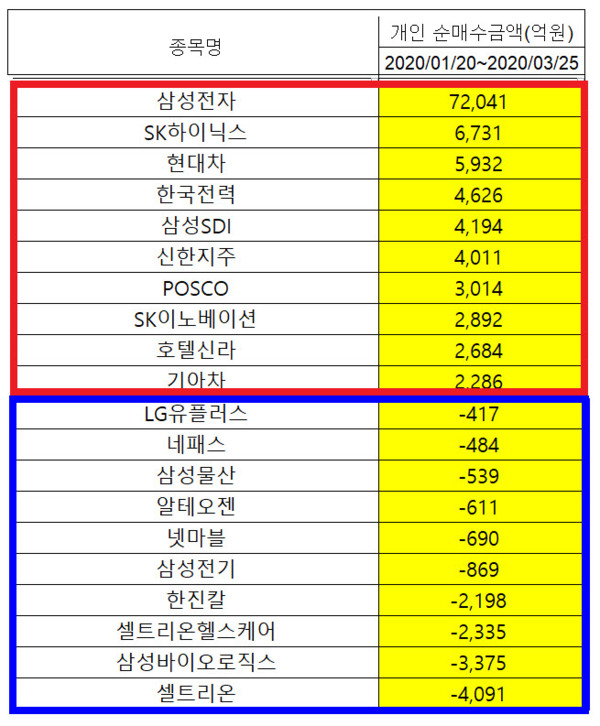 첫 코로나19 확진자가 발생한 1월 20일에서 이달 25일까지 에프앤가이드가 취합한 개인 투자자 순매수, 순매도 종목에 따르면 이 기간 개인들이 가장 많이 사들인 종목은 단연 삼성전자로 꼽혔다. 개인들은 이 시기 삼성전자를 7조2041억원 어치 사들였다. <하단 표 참조>