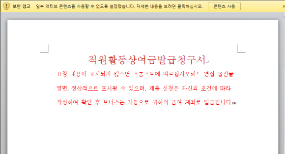 공격자는 먼저 '직원활동상여금발급청구서.doc'라는 제목의 악성 문서파일을 메일 첨부파일로 유포했다. 또 해당 악성 문서파일에 '(신청서) 확인 후 보너스는 자동으로 귀하의 급여계좌로 입금된다'는 내용을 포함시켜 사용자의 관심을 끌었다.