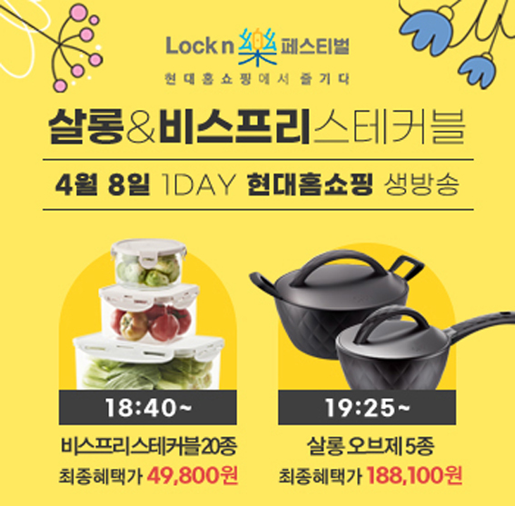 한편 락앤락은 락앤락 페스티벌을 기념해 오는 8일까지 현대H몰에서 락앤락 베스트셀러 제품을 할인가에 판매하고 있다. 미니공기청정기 등 소형가전부터 쿡웨어, 도시락 등 유용한 주방용품을 살펴볼 수 있으며, 방송 예정인 비스프리 스테커블과 살롱 드 오브제도 사전에 구매할 수 있다.