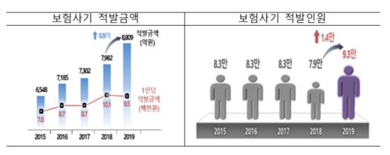 8일 금융감독원에 따르면 2019년 중 보험사기 적발금액은 8809억원으로 전년 대비 10.4%(827억원) 증가했다. 적발 인원은 9만2538명으로 2015년 이후 정체·감소추세를 보이다가 지난해 크게 증가(1만3359명, 16.9%↑)했다. 매일 평균 254명, 24억원의 보험사기가 적발된 셈이다.