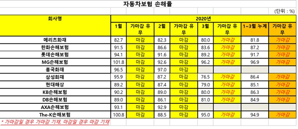 실제 올해 1~3월 누계 손해율을 살펴보면 삼성화재는 86.4%, 현대해상(85.1%), KB손보(86.3%), DB손해보험(84.9%), 메리츠화재(81.8%)다.