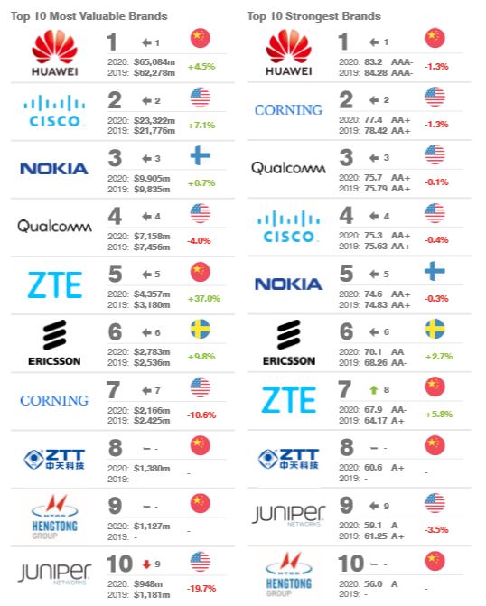 화웨이와 글로벌 5G 시장에서 치열하게 경쟁하고 있는 에릭슨과 노키아는 '가장 가치있는 브랜드 Top10'부문에서 약 27.8억달러(약 3.4조원), 약 99억달러(약 12조원)로 각각 조사됐다.
