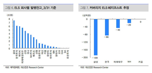 대신증권 박혜진 연구원은 "자체헤지 비중이 큰 증권사가 손실폭도 클 것이며 이 비중이 0%인 키움증권을 제외한 나머지 대형 4사(삼성한국미래NH) 1분기 ELS 헤지 비용은 3420억원으로 추정된다"고 언급했다.