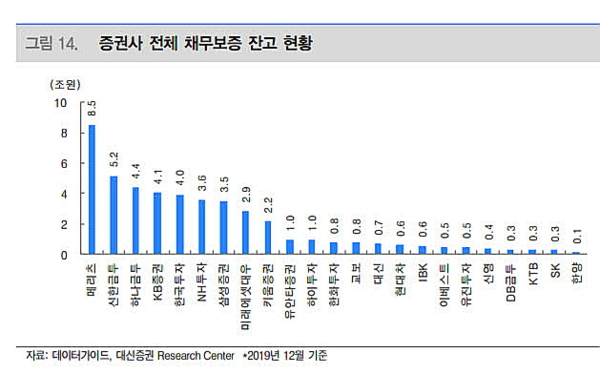 국내 증권사 지난해말 기준 채무보증 잔고는 46.2조원으로 추산된다. 가장 큰 비중을 차지하는 증권사는 메리츠증권(8.5조)이다. 이밖에 신한금융투자(5.2조), 하나금융투자(4.4조), KB증권(4.1조), 한국투자증권(4조원), NH투자증권(3.6조), 삼성증권(3.5조) 순이다.