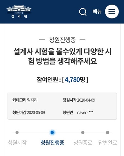 그는 "다른 직업이나 아르바이트도 구하기 힘든 상황"이라며 "설계사로 생업을 가질 수 있게끔 야외시험이나 온라인 시험 등 다양한 방안을 마련해달라"고 요청했다. 지난 9일 등록된 해당 국민청원은 이날 오전 10시 현재 4780명이 동의했다.