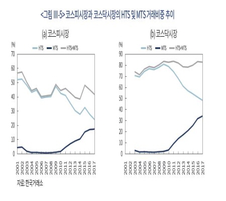 이성복 자본시장연구원 연구위원은 "HTS의 거래비중은 2010년 전후로 MTS가 도입되기 전까지 코스피시장의 경우 40~50% 내에서 등락하고, 코스닥시장의 경우 70~80% 내에서 상승하다가 MTS가 도입된 이후부터 빠르게 감소했다"며 "반대로 MTS의 거래비중은 코스피시장과 코스닥시장 모두에서 빠르게 증가했다"고 분석했다.